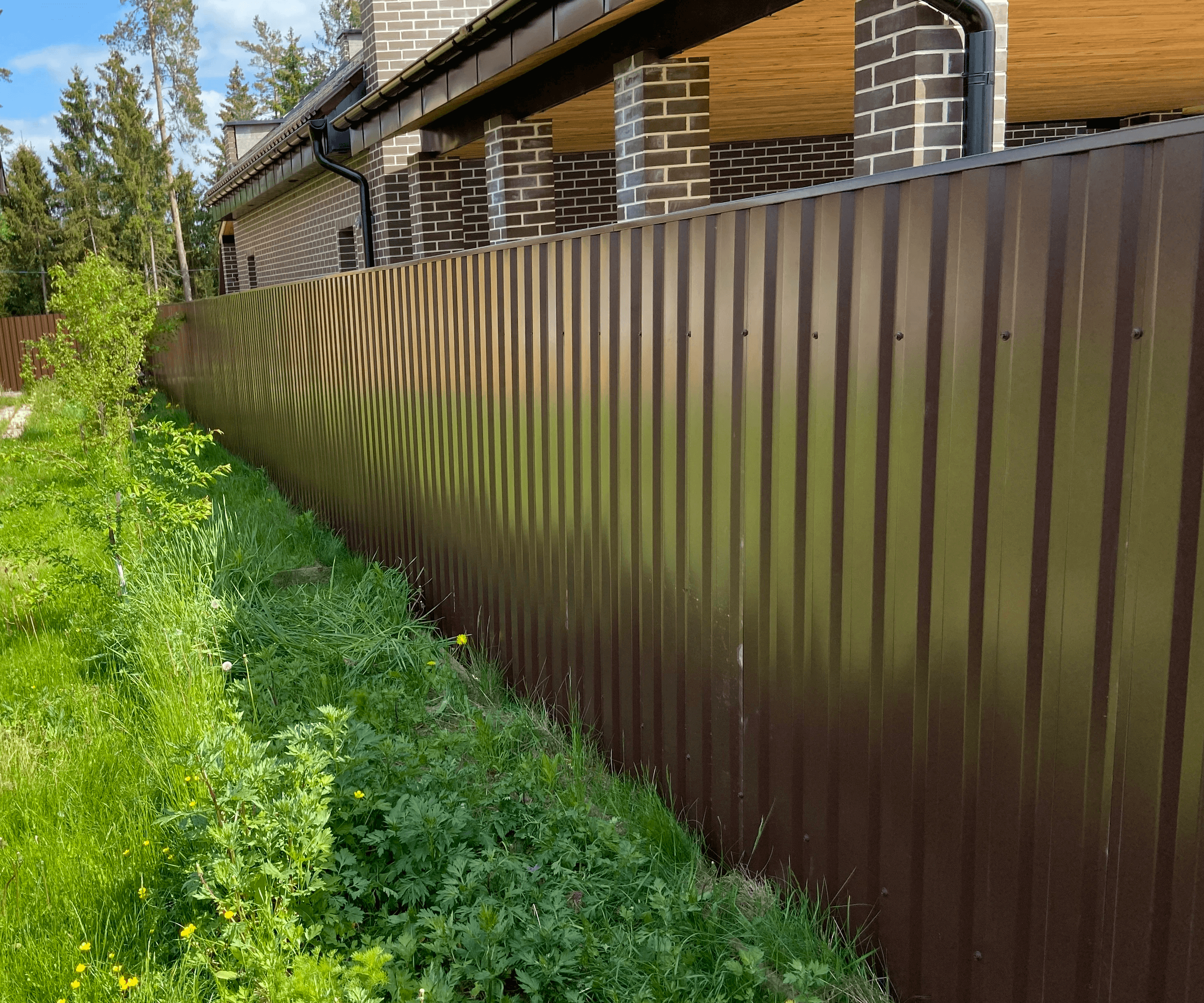 Металлическое ограждение с оцинкованными листами. Популярен за счёт прочности, простоты установки и доступной цены.