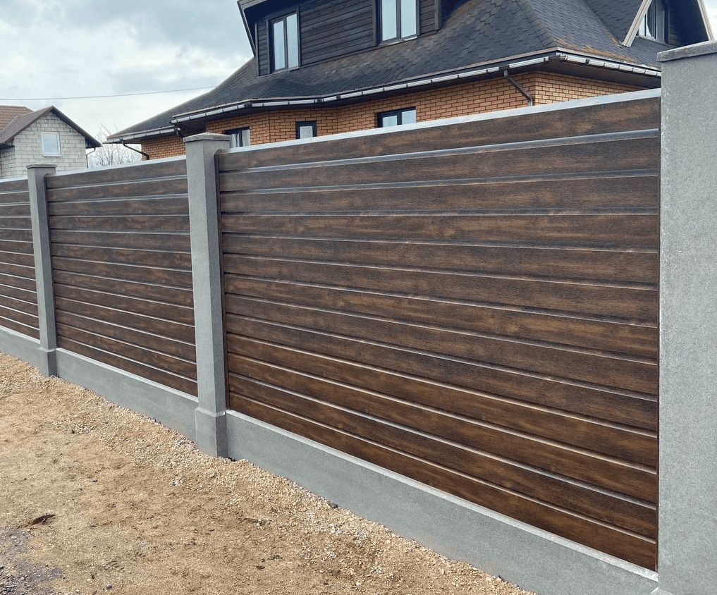 Забор из вертикальных или горизонтальных планок. Эстетичный и долговечный, напоминает деревянный аналог, но не требует ухода.